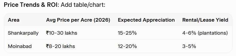 - ₹4-12 lakhs/acre, fast appreciation.